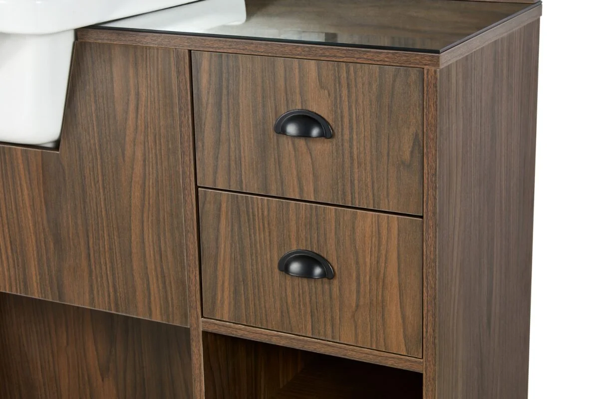 - Vasque Spacieuse et Solide : Conçue pour offrir confort et durabilité, la vasque s’intègre parfaitement dans ce meuble de barbier.