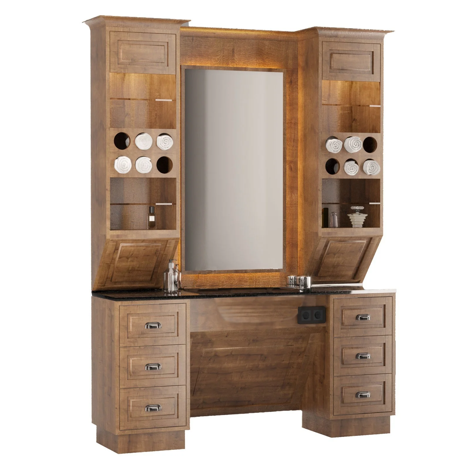 Fabriqué en bois aux teintes chaudes, Le Royal offre une esthétique traditionnelle qui apporte chaleur et une atmosphère accueillante au salon. Ce meuble se distingue non seulement par son vaste espace de rangement, comprenant tiroirs et étagères pour produits et serviettes, mais aussi par son grand miroir permettant aux clients de profiter pleinement de leur transformation.