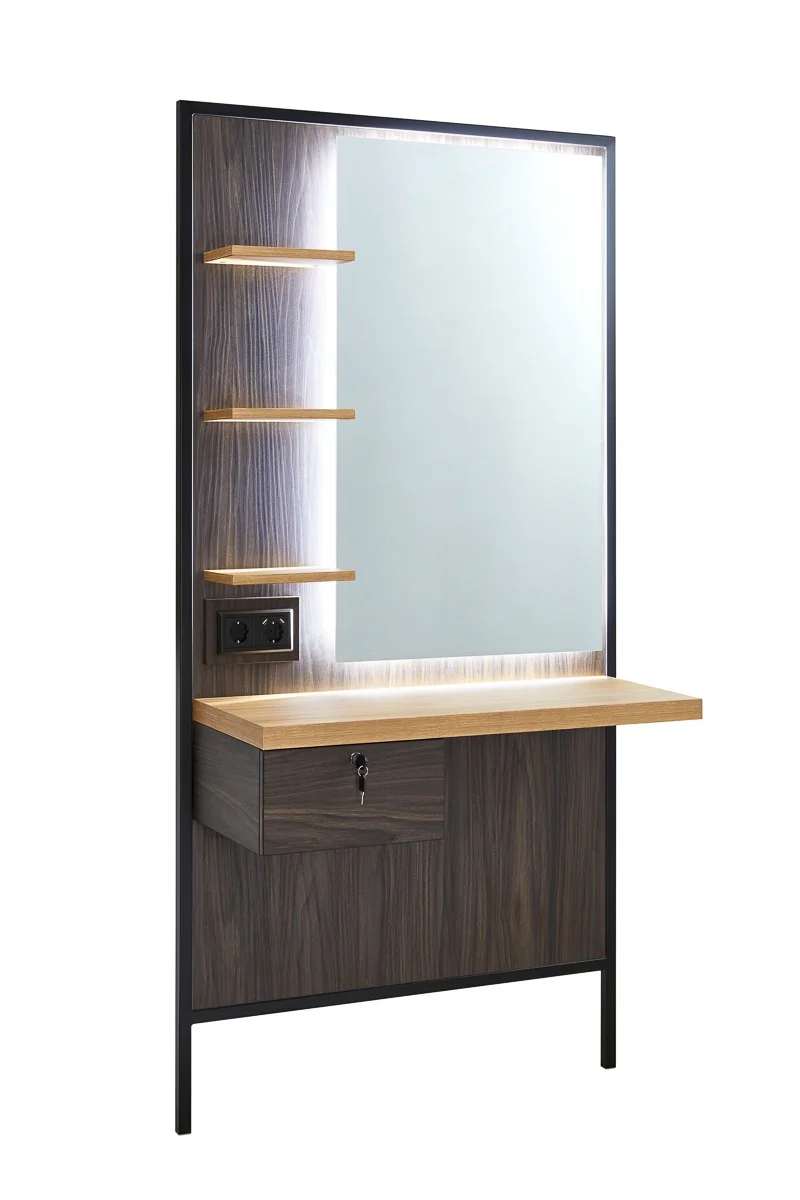 Logan – Meuble de Barbier avec Miroir : Un design minimaliste qui incarne modernité et fonctionnalité, avec un grand miroir, des étagères pratiques et un tiroir avec serrure. Logan est l’élément central qui apporte classe et efficacité à tout salon de coiffure.