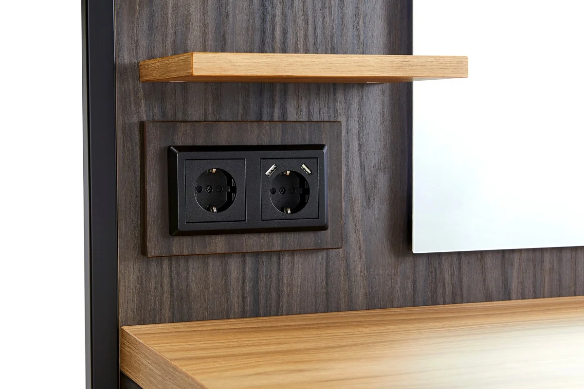 Le meuble se distingue par sa combinaison de bois sombre et de détails en teintes claires, offrant un contraste à la fois moderne et accueillant. Le grand miroir est complété par des étagères fournissant un espace pratique pour les produits et les décorations, tandis que le tiroir intégré assure que les outils essentiels soient en sécurité et à portée de main.
