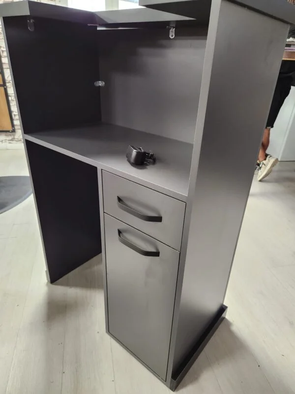 - Espace de Travail Optimal : La large surface supérieure offre suffisamment d’espace pour une caisse, des systèmes de point de vente et pour effectuer des transactions de manière confortable et professionnelle.