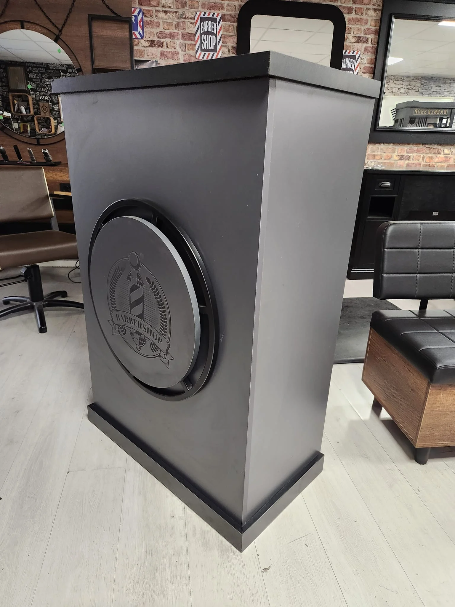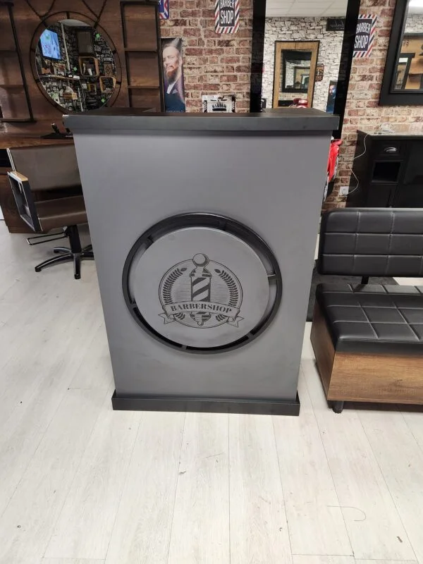 Le meuble d’accueil Shop est le cœur de toute barberie ou salon de beauté de prestige. Il combine une esthétique professionnelle avec un design fonctionnel qui attire l’attention dès le premier regard, grâce à son logo circulaire distinctif à l’avant, invitant à l’exclusivité et au service personnalisé.