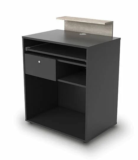 Le Small est parfaitement adapté aux salons de beauté qui recherchent fonctionnalité et design dans un espace limité. Fabriqué en aggloméré haute densité et revêtu de papier mélaminé noir, ce meuble promet durabilité et élégance. Les bords en PVC avec angles arrondis assurent un design sécurisé et accessible. Il dispose d’un tiroir coulissant avec serrure et clé, d’un plateau coulissant pour clavier et d’un système de gestion des câbles, facilitant ainsi l’organisation et la gestion quotidienne. Le panneau avant avec finition en béton ciré ajoute une touche moderne et sophistiquée, idéale pour tout décor de salon.